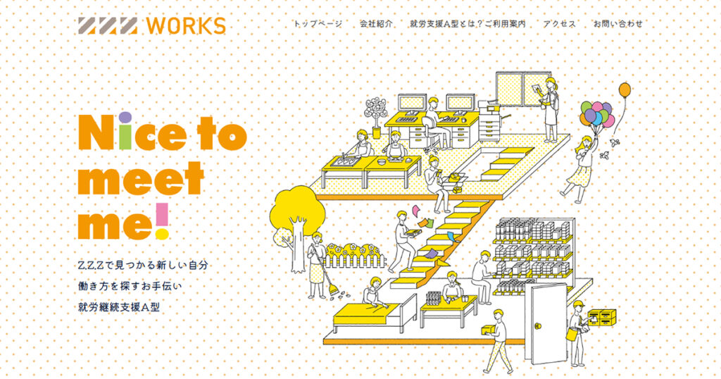 株式会社ZZZ WORKSのホームページ制作に携わらせていただきました。 就労継続支援A型の会社様ということで、誰にでも明るくポップなイメージでと制作させていただきました。 詳細はこちらをご覧ください。